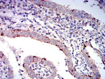 Immunohistochemical analysis of paraffin-embedded human endometrial cancer tissues using BAX mouse mAb with DAB staining.