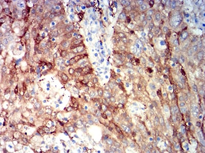 Immunohistochemical analysis of paraffin-embedded human cervical cancer tissues using ALDH1A1 mouse mAb with DAB staining.