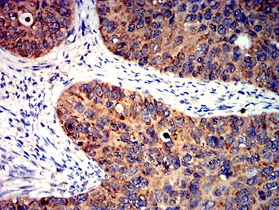 Immunohistochemical analysis of paraffin-embedded human cervical cancer tissues using BCL2L2 mouse mAb with DAB staining.