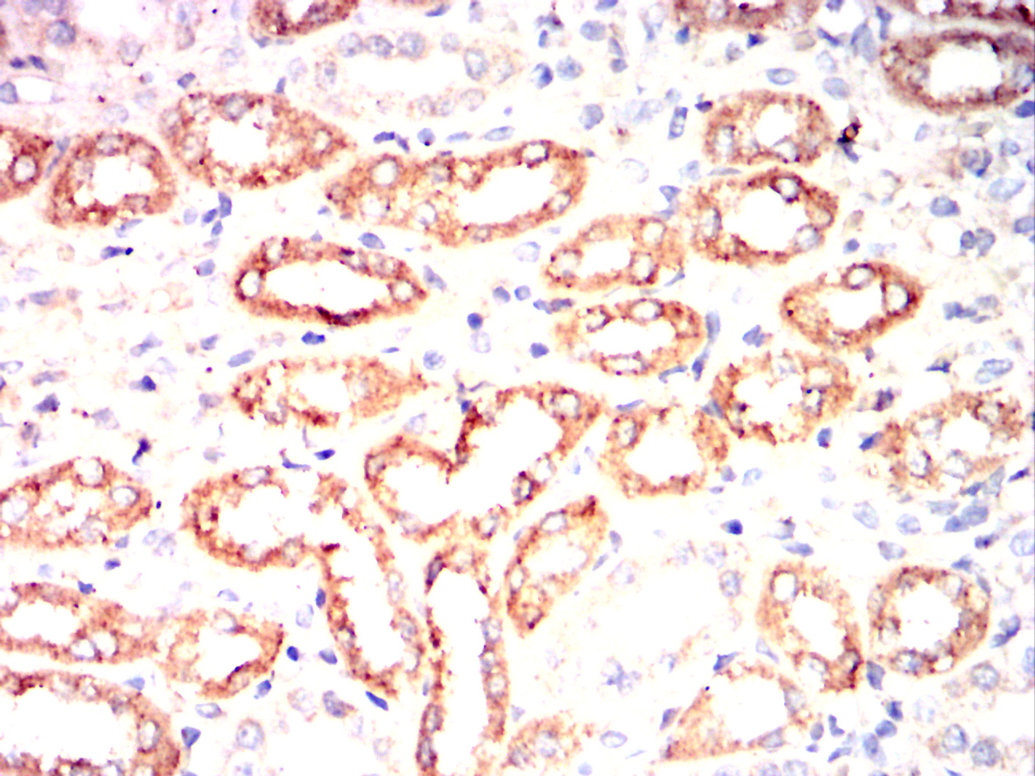 Immunohistochemical analysis of paraffin-embedded Rabbit kidney using CHRNA7 mouse mAb with DAB staining.