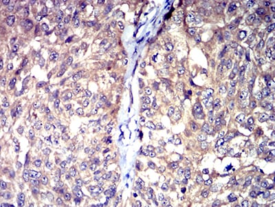 Immunohistochemical analysis of paraffin-embedded human bladder cancer tissues using HTR3A mouse mAb with DAB staining.