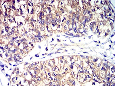 Immunohistochemical analysis of paraffin-embedded human bladder cancer tissues using CD195 mouse mAb with DAB staining.