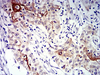 Immunohistochemical analysis of paraffin-embedded human bladder cancer tissues using CD183 mouse mAb with DAB staining.
