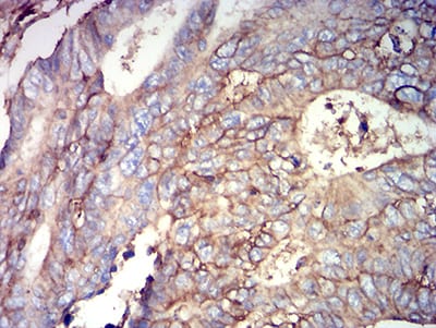 Immunohistochemical analysis of paraffin-embedded human rectum cancer tissues using CD44 mouse mAb with DAB staining.