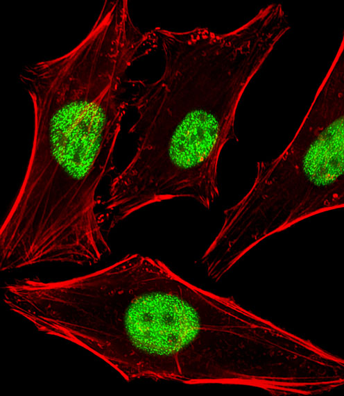 Fluorescent image of Hela cells stained with PPHLN1 Antibody (N-term)(Cat#P32548). P32548 was diluted at 1:25 dilution. An Alexa Fluor 488-conjugated goat anti-rabbit lgG at 1:400 dilution was used as the secondary antibody (green). Cytoplasmic actin was counterstained with Alexa Fluor® 555 conjugated with Phalloidin (red).