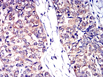 Immunohistochemical analysis of paraffin-embedded human bladder cancer tissues using CD53 mouse mAb with DAB staining.