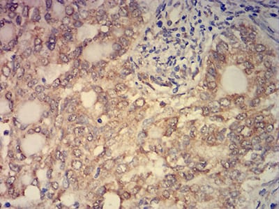 Immunohistochemical analysis of paraffin-embedded human cervical cancer tissues using KAT2B mouse mAb with DAB staining.