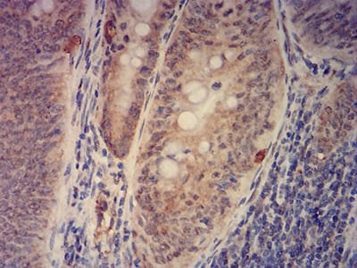 Immunohistochemical analysis of paraffin-embedded human rectum cancer tissues using KAT2B mouse mAb with DAB staining.