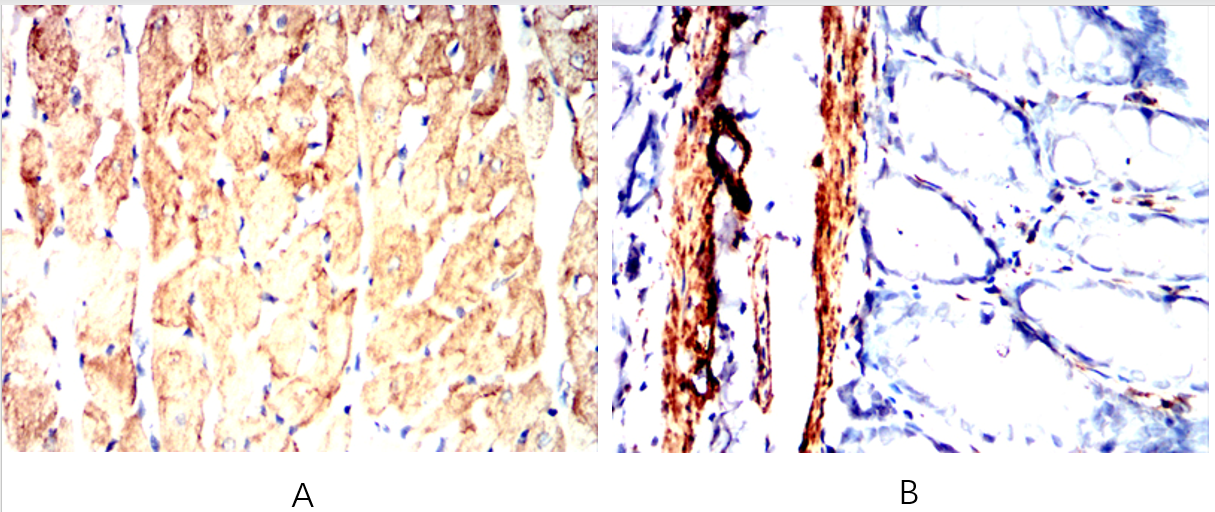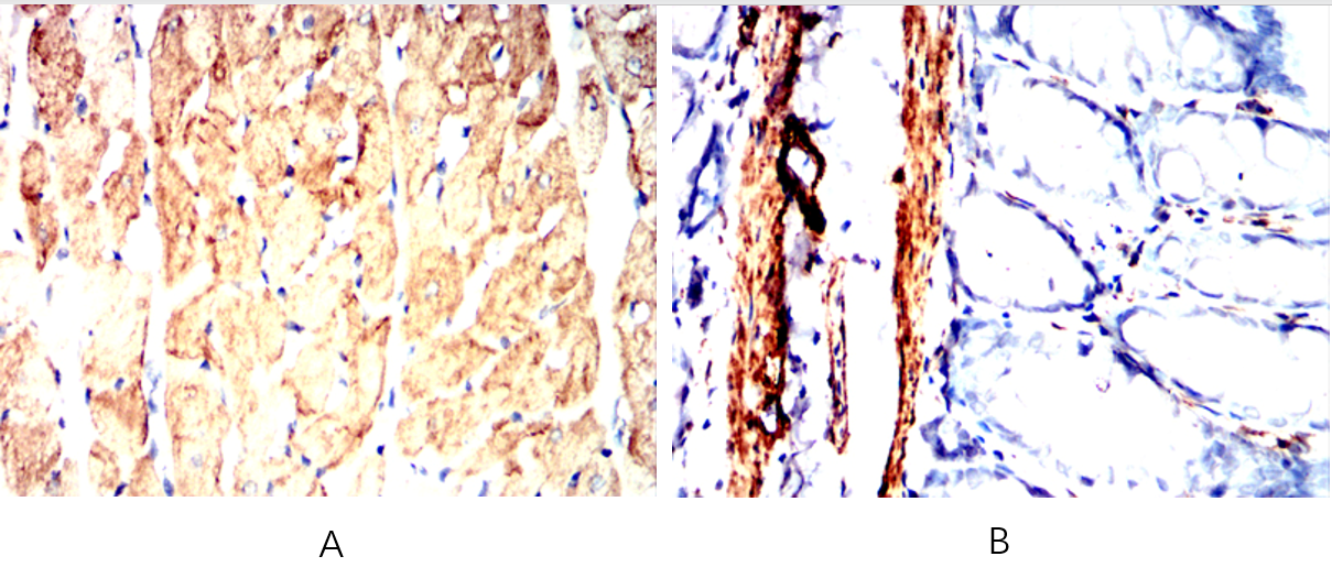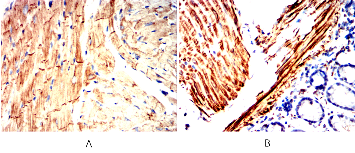 Immunohistochemical analysis of paraffin-embedded Rabbit Heart(A) Rabbit rectum(B) using Desmin mouse mAb with DAB staining.