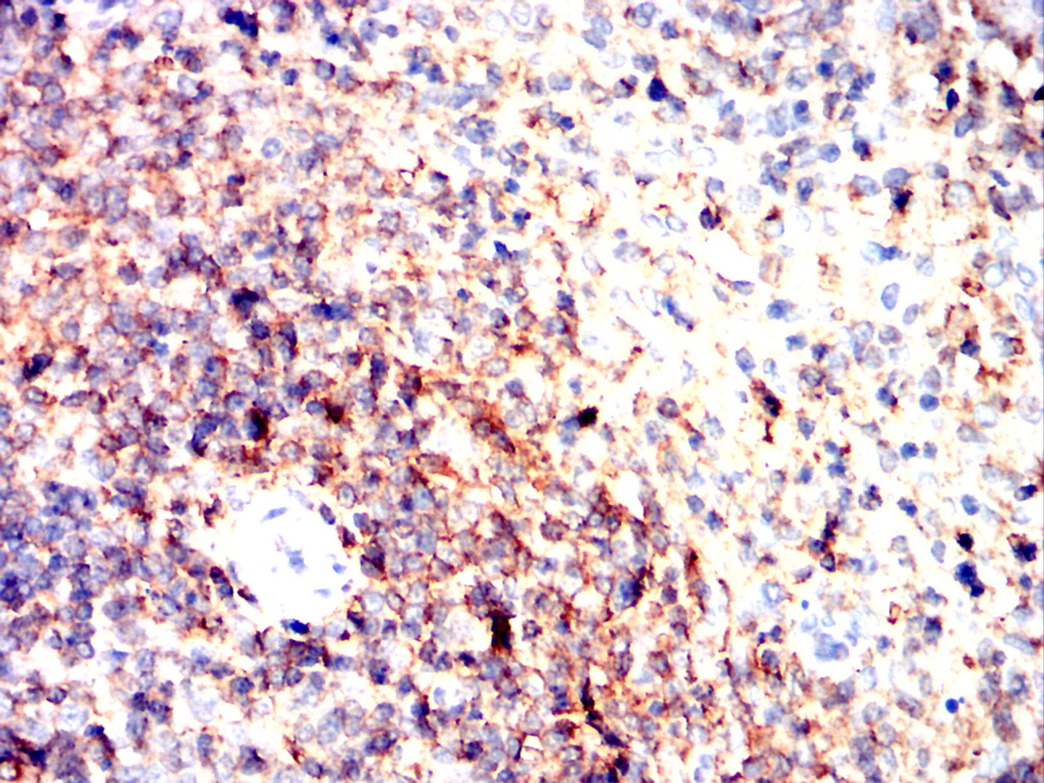 Immunohistochemical analysis of paraffin-embedded Rabbit spleen using CD80 mouse mAb with DAB staining.
