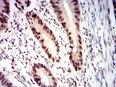 Immunohistochemical analysis of paraffin-embedded human rectum cancer tissues using RBBP7 mouse mAb with DAB staining.