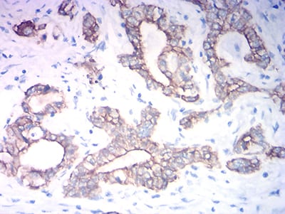 Immunohistochemical analysis of paraffin-embedded human colon cancer tissues using KRT19 mouse mAb with DAB staining.