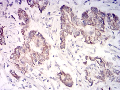 Immunohistochemical analysis of paraffin-embedded human stomach cancer tissues using CYCS mouse mAb with DAB staining.