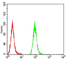 Flow cytometric analysis of Hela cells using PMS2 mouse mAb (green) and negative control (red).