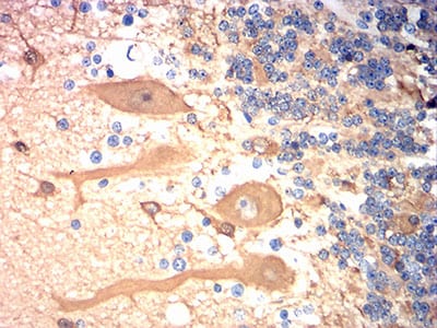 Immunohistochemical analysis of paraffin-embedded human cerebellum tissues using TUBB3 mouse mAb with DAB staining.