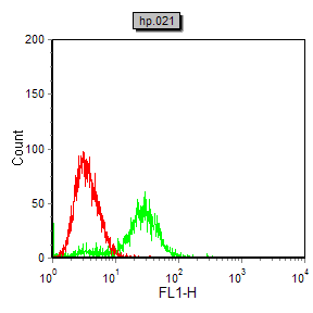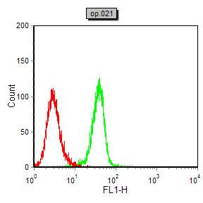 Flow cytometric analysis of NIH/3T3 cells using COL1A2 mouse mAb (green) and negative control (red).