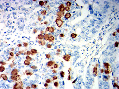 Immunohistochemical analysis of paraffin-embedded human rectum cancer tissues using MUC2 mouse mAb with DAB staining.