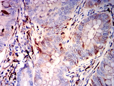 Immunohistochemical analysis of paraffin-embedded human rectal cancer tissues using GSN mouse mAb with DAB staining.