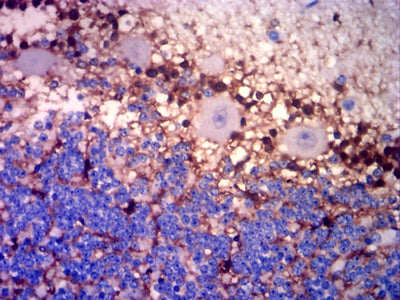 Immunohistochemical analysis of paraffin-embedded human cerebellar tissues using GLUL mouse mAb with DAB staining.