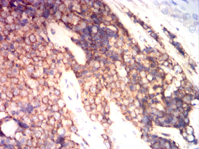 Immunohistochemical analysis of paraffin-embedded human bladder cancer tissues using CD99 mouse mAb with DAB staining.
