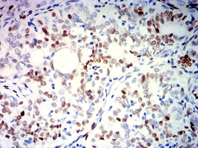 Immunohistochemical analysis of paraffin-embedded human breast cancer tissues using PGR mouse mAb with DAB staining.