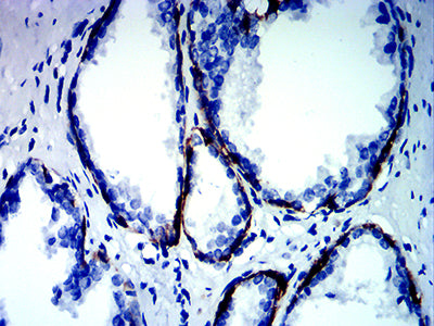 Immunohistochemical analysis of paraffin-embedded human prostate cancer tissues using KRT13 mouse mAb with DAB staining.