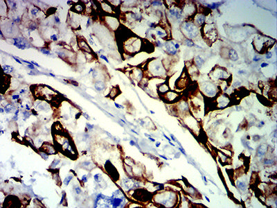 Immunohistochemical analysis of paraffin-embedded human breast cancer tissues using KRT13 mouse mAb with DAB staining.