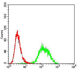 Flow cytometric analysis of Hela cells using BAX mouse mAb (green) and negative control (red).