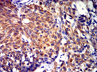 Immunohistochemical analysis of paraffin-embedded human esophageal cancer tissues using KRT9 mouse mAb with DAB staining.
