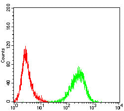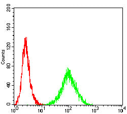 Flow cytometric analysis of Hela cells using CD47 mouse mAb (green) and negative control (red).