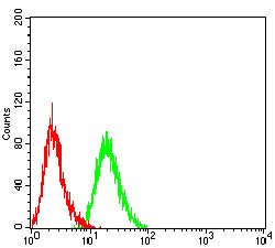 Flow cytometric analysis of Hela cells using CDH1 mouse mAb (green) and negative control (red).