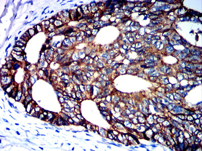 Immunohistochemical analysis of paraffin-embedded human rectal cancer tissues using CDH1 mouse mAb with DAB staining.