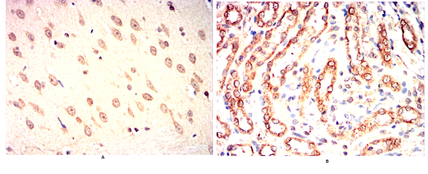 Immunohistochemical analysis of paraffin-embedded Rat brain(A) Rat kidney(B) using Calreticulin mouse mAb with DAB staining.
