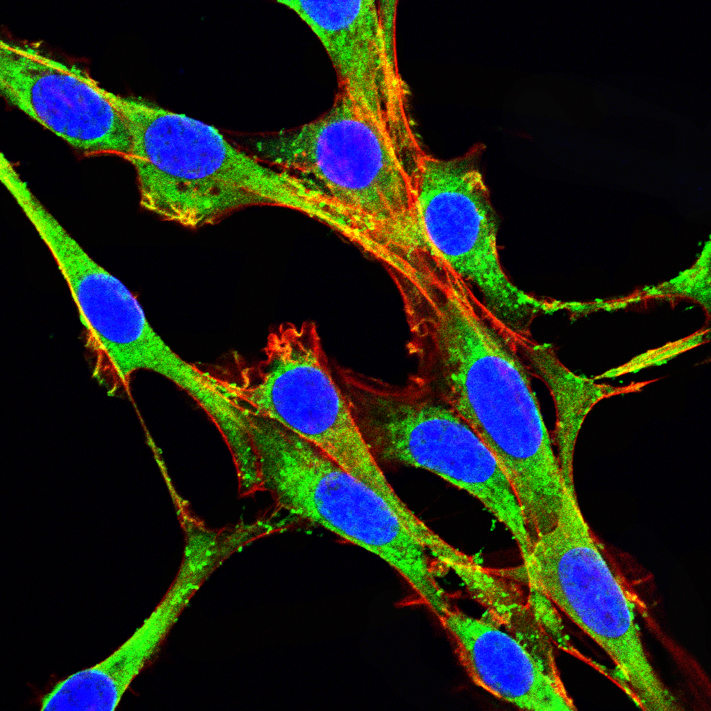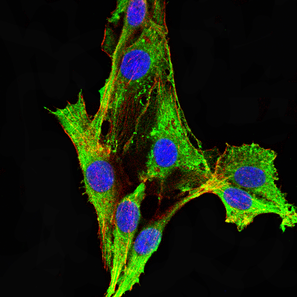 Immunofluorescence analysis of NIH/3T3 cells using Calreticulin mouse mAb (green). Blue: DRAQ5 fluorescent DNA dye. Red: Actin filaments have been labeled with Alexa Fluor- 555 phalloidin.