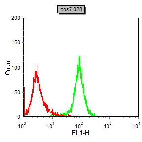 Flow cytometric analysis of COS7 cells using Calreticulin mouse mAb (green) and negative control (red).