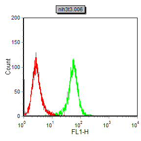 Flow cytometric analysis of NIH/3T3 cells using Calreticulin mouse mAb (green) and negative control (red).
