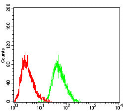 Flow cytometric analysis of Hela cells using CD338 mouse mAb (green) and negative control (red).