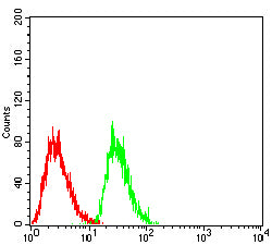 Flow cytometric analysis of HepG2 cells using MSH2 mouse mAb (green) and negative control (red).