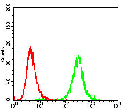 Flow cytometric analysis of Hela cells using BAX mouse mAb (green) and negative control (red).