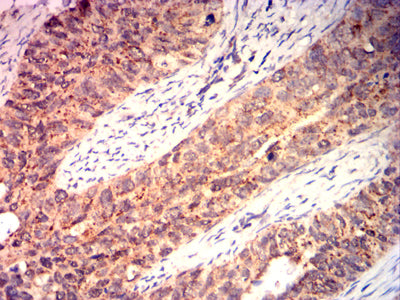 Immunohistochemical analysis of paraffin-embedded human cervical cancer tissues using BAX mouse mAb with DAB staining.