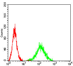 Flow cytometric analysis of HepG2 cells using CCL27 mouse mAb (green) and negative control (red).