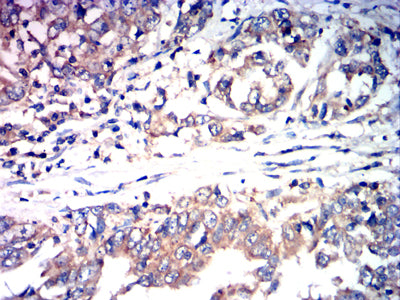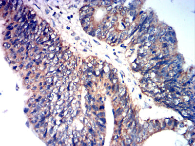 Immunohistochemical analysis of paraffin-embedded human rectal cancer tissues using CCL27 mouse mAb with DAB staining.