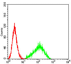 Flow cytometric analysis of THP-1 cells using CCR10 mouse mAb (green) and negative control (red).