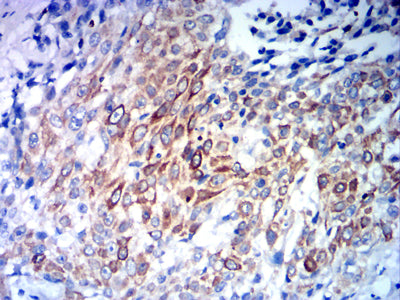 Immunohistochemical analysis of paraffin-embedded human esophageal cancer tissues using CCR10 mouse mAb with DAB staining.