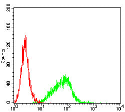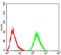 Flow cytometric analysis of Hela cells using CDH1 mouse mAb (green) and negative control (red).