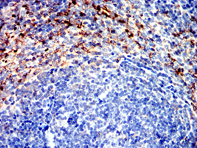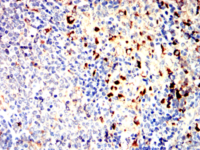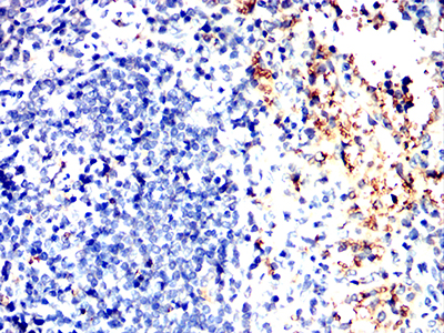 Immunohistochemical analysis of paraffin-embedded Rabbit spleen using ABCA1 mouse mAb with DAB staining.