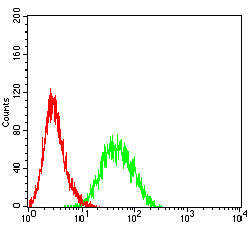 Flow cytometric analysis of HL-60 cells using C5AR2 mouse mAb (green) and negative control (red).