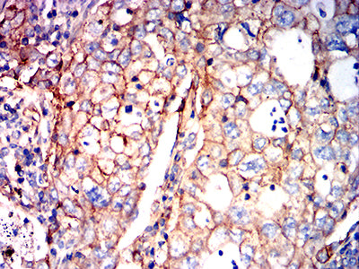 Immunohistochemical analysis of paraffin-embedded human lung cancer tissues using ATP1A1 mouse mAb with DAB staining.