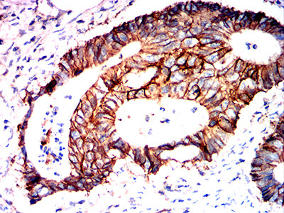 Immunohistochemical analysis of paraffin-embedded human rectum cancer tissues using ATP1A1 mouse mAb with DAB staining.