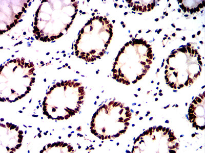 Immunohistochemical analysis of paraffin-embedded human colon tissues using HDAC1 mouse mAb with DAB staining.
